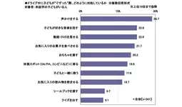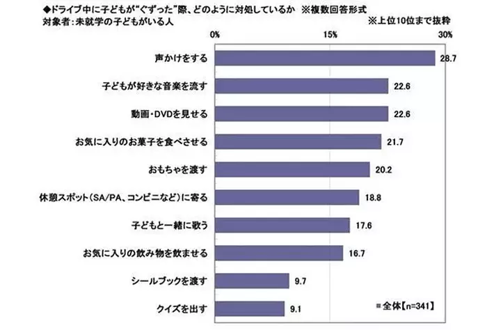 また、ドライブ中に子どもが“ぐずった”際、どのように対処しているかを聞いたところ、1位「声かけをする」(28.7%)、2位「子どもが好きな音楽を流す」「動画・DVDを見せる」(いずれも22.6%)、4位「お気に入りのお菓子を食べさせる」(21.7%)、5位「おもちゃを渡す」(20.2%)となりました。