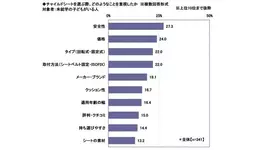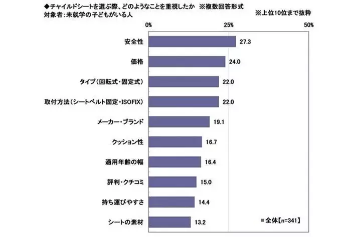 未就学の子どもがいる方341名に、チャイルドシートを選ぶ際、どのようなことを重視したかを聞いたところ、「安全性」(27.3%)が最も多くなりました。次いで、「価格」(24.0%)、「タイプ(回転式・固定式)」「取付方法(シートベルト固定・ISOFIX)」(いずれも22.0%)、「メーカー・ブランド」(19.1%)が続きました。