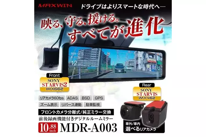 MDR-A00360FPSのリアカメラ、高輝度液晶モニター、GPSを本体に内蔵した10.88インチのデジタルルームミラーです。純正ミラーに近いサイズで違和感がなく、車内の雰囲気を壊さずスッキリ設置できます。 フロントカメラはSTARVIS2のイメージセンサー(SONY IMX662)を採用。高画質録画ドライブレコーダー機能であおり運転対策もOK。