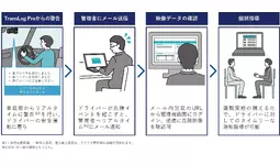 本製品は、車内外約360°の映像を撮影し、事故リスクとなる居眠り運転・脇見運転・信号無視などを検出し、警告音や音声でドライバーへ通知、管理者にはメールで通知を行います。また、TOYOTA MOBILTY PORTAL(Webサービス)における走行データ・車両情報の一元管理や、AIによる高度な運転診断、危険挙動検出 及び運転日報の自動作成などを実現します。