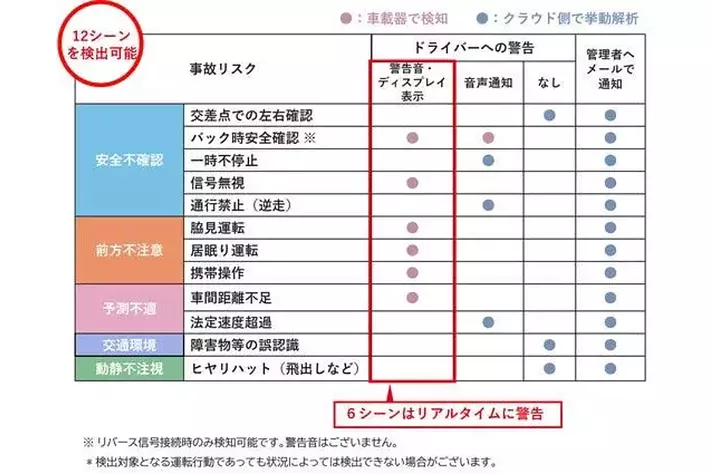■人的事故要因の約7割を占める「12シーン」をAIが検出すると、自動でドライバー・管理者に警告・通知