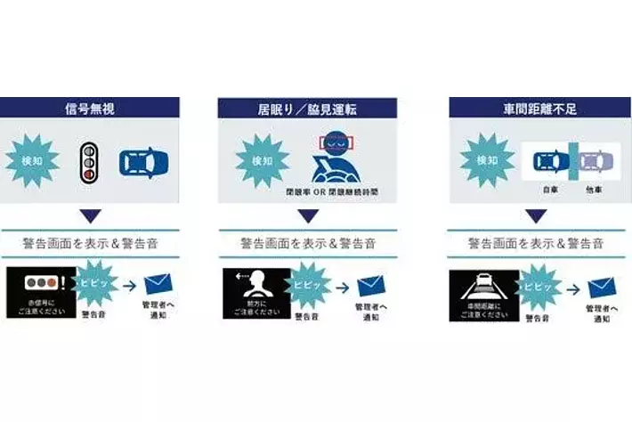 事故リスクを検出すると警告音や音声でドライバーへ通知。また、管理者にはメールで通知を行います。