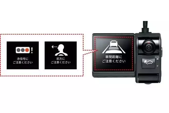 危険な車間距離や急アクセルなどを検知すると、ディスプレイに表示。音声でも警告します。車載器の状態も表示し、各種設定も車載器単体でできるよう、操作性が向上しました。