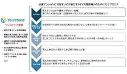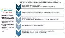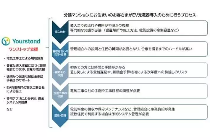 ユアスタンドは、集合住宅の管理組合と充電器設置に係る合意を形成する支援、補助金申請、現地調査、設置工事、運用アプリ提供までを一気通貫でサポートし、充電器設置に関するお客さまの負担を大幅に軽減します。