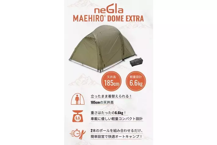 大きなファミリー用は不要、かといって腰を屈める小型テントも選びたくない。積載しやすく、設営は簡単で立って動ける高さと前室の余裕があること。その答えとして誕生したのが、「マエヒロドーム エクストラ」です。バイクキャンプで培った快適・軽量・コンパクトのコンセプトを軸に、デュオキャンプに無理なくフィットするサイズバランスと居住性を追求しました。