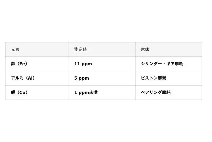 今回の分析では、エンジン内部の摩耗状態を示す金属成分を測定しました。エンジン摩耗を示す金属成分