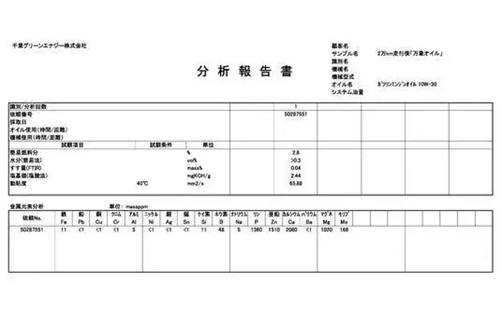 本分析は、潤滑油分析を専門とする第三者機関により実施され、エンジンオイル中の摩耗金属および劣化指標について科学的な評価が行われました。