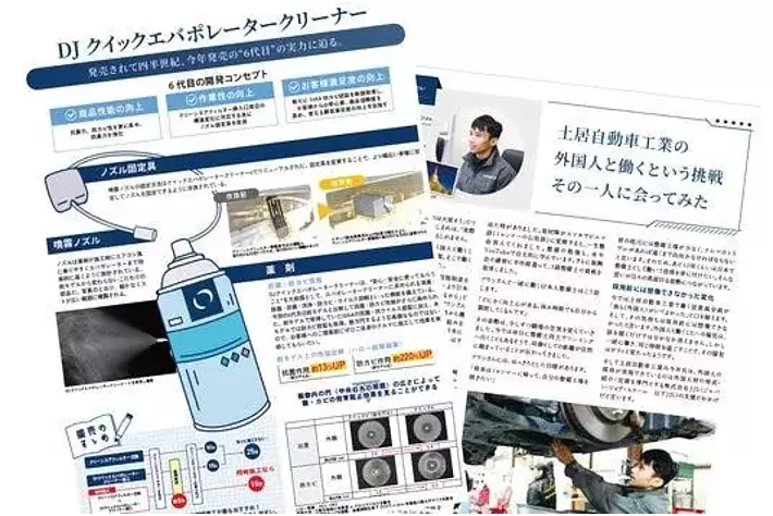 紙面を8ページに倍増した今月発刊の第2号は、同じくトヨタモビリティパーツ株式会社に取材し、夏に向けて需要の高まるエアコン洗浄剤(エバポレータークリーナー)を特集しています。加えて、整備業界に重くのしかかる人材不足について、外国人採用のリアルを兵庫県の土居自動車工業株式会社と、外国人材紹介事業の株式会社JJSに取材しました。
