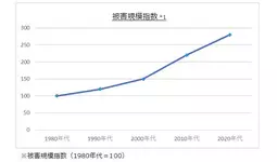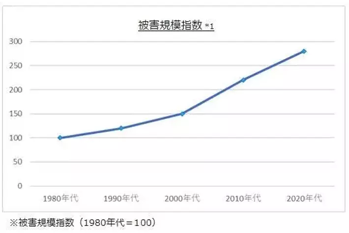 *1 本グラフは、気象庁の災害事例、農林水産省の被害統計、防災科学技術研究所の資料を基に、発生頻度および被害規模を指数化(1980年代=100)したものです。件数を示すものではありません