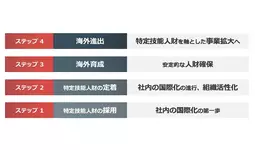 つまり、特定技能制度を通じて外国籍人財を受け入れ人手不足を解消し、安定した人財獲得の土台を構築するために海外現地での育成を行います。これらのステップを通じて、企業はその国について理解を深め、最終的には多く受け入れている外国籍人財の母国を海外進出先として捉えビジネスを始めるのです。