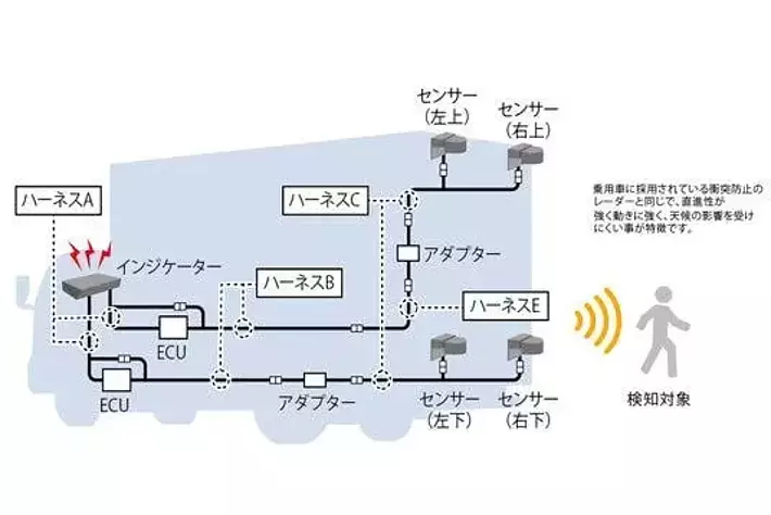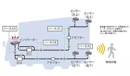 本製品は、車両後面の上下左右4か所に配置したミリ波センサーが、ドライバーから見えにくい死角に存在する障害物を高精度で検知し、車室内に設置したインジケーター音と光でリアルタイムに警告する後退支援システムです。