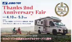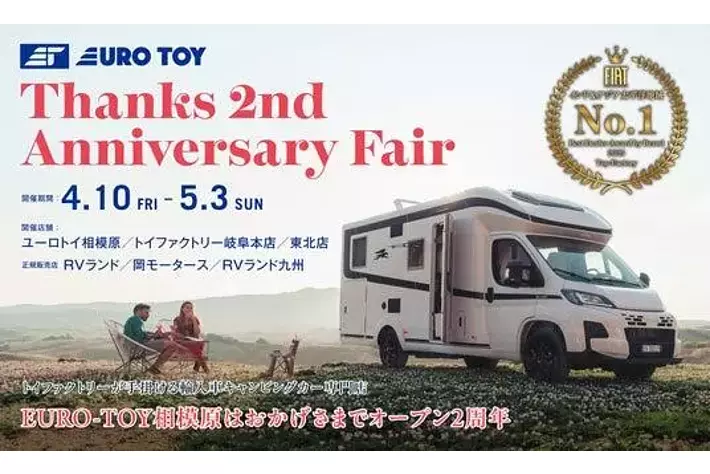 キャンピングカー製造台数で国内首位(ハイエースベース)を誇り、FIAT DUCATO(フィアット デュカト)ベースのキャンピングカー販売台数でアジアNo.1を達成する株式会社トイファクトリー(本社:岐阜県可児市、代表取締役:藤井昭文)は、4月10日(土)~5月3日(日)の期間、EURO-TOY相模原オープン2周年記念「Thanks 2nd Anniversary Fair」を開催いたします。