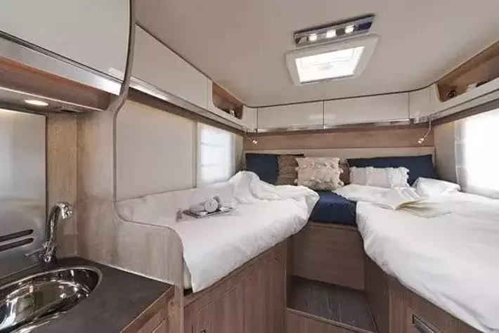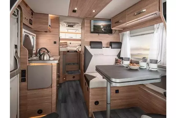 乗車定員4名・最大就寝人数5名で、約7mのボディながら取り回しに優れ、長距離移動も快適にこなせる安定した走行性能と高い安全性を備えています。