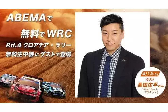 新しい未来のテレビ「ABEMA(アベマ)」は、2026年シーズンの世界公道最速を決める最高峰のラリー競技『FIA世界ラリー選手権(以下、WRC)』の全14戦を無料生中継しております。このたび、第4戦『クロアチア・ラリー』の放送を彩るスタジオゲストとして、チョコレートプラネット・長田庄平の出演が決定いたしました。