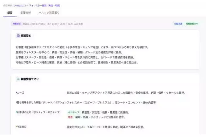 今回のPoCでは、SUBARUと当社AX(AI Transformation)コンサルタントが協働し、商談の対話データをAIで解析することで、現場で活用しやすい形で、対話内容を“見える化”し、次に取るべきアクションや改善ポイントを現場に提示できる運用を検証しました。