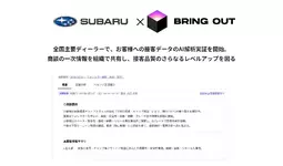ブリングアウト株式会社(本社:東京都、代表取締役:中野 慧、以下「当社」)は、株式会社SUBARU(以下、SUBARU)が推進する販売・接客改革の一環として、当社が提供する対話データを起点とした経営変革プラットフォーム「BRING OUT」について、PoC(概念実証)での成果を踏まえ、全国150以上の店舗/1,000名以上の方が参加する大規模なトライアルフェーズへ移行することを決定しましたので、お知らせします。