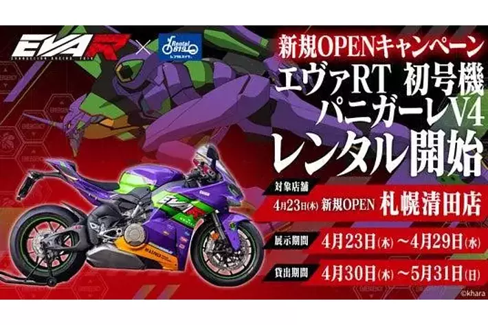 また、札幌清田店のオープンを記念し、エヴァンゲリオンレーシングとのコラボレーション企画として展開している特別仕様車両「エヴァRT 初号機 パニガーレV4」を期間限定で展開いたします。レンタル819ならではの、“見るだけで終わらない、実際に乗れる特別な体験”を北海道でも提供してまいります。