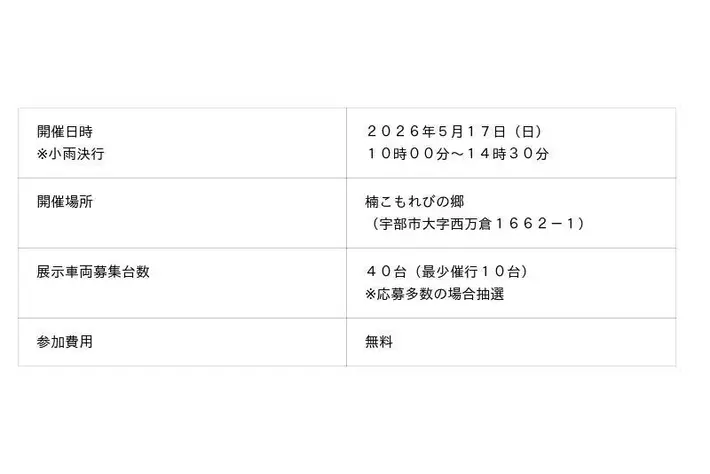JAF(一般社団法人 日本自動車連盟)山口支部(支部長 佐藤宏彦)は、5月17日(日)に、楠こもれびの郷(山口県宇部市)にて、SUV・RVなどの四輪駆動車(以下、「四駆」)を集めた初の試みとなるイベント、「JAFデー 四駆ミーティング in 楠こもれびの郷」を開催いたします。
