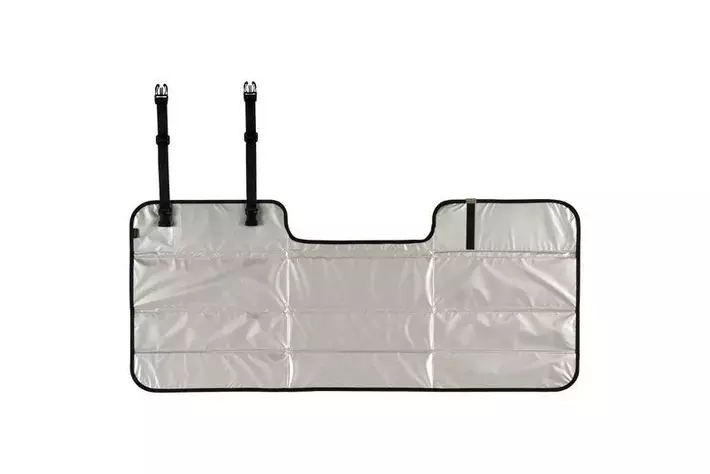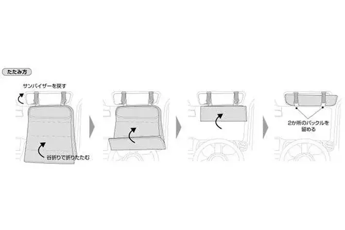 サンバイザーに取り付けた状態からバックルを外して広げるだけで、フロントガラス全面をすばやくカバー。広げたサンシェードは、助手席サンバイザーに設置した面ファスナーに固定でき、運転席からもスムーズに設置できます。また、サンシェード中央部上側はルームミラーを避けるよう余裕を持たせたカッティングにし、設置後のミラー再調整も不要です。
