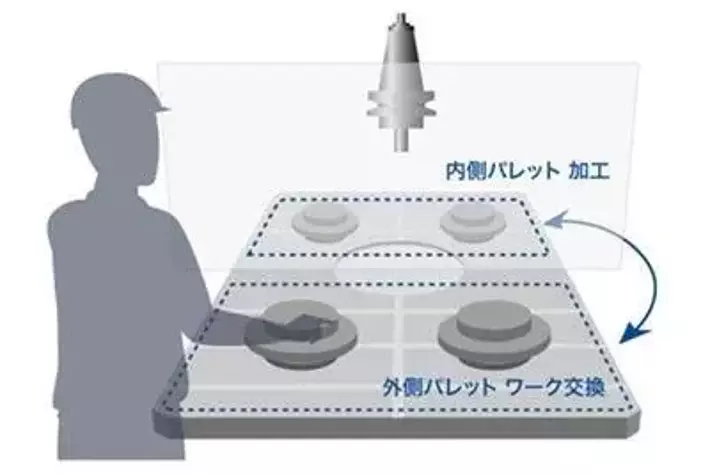 SPEEDIO Rシリーズでは、機械内部を加工エリアと段取りエリアの2つに分割し、パレットチェンジャーを搭載することで、加工中でも段取りエリアで加工物の交換を行うことが可能。パレットの回転時以外は加工が止まらないため、パレットチェンジャー非搭載のマシニングセンタと比較して機械稼働率や生産性が高い点が特長で、2014年の発売以来、多くのお客様から高い支持を得ている。