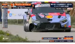 スタジオの熱気そのままに迎えた『クロアチア・ラリー』本戦の最終日(デイ3)では、誰もが予想しなかった劇的な結末が待っていました。最終ステージ(SS20)を迎えた時点では、ティエリー・ヌービル選手(ヒョンデ)が後続の勝田選手に対して1分15秒もの大差をつけて首位を独走しており、普通に走れば追い抜くことは困難な盤石の状況でした。しかし、最終走者のヌービル選手の走行が始まると、中盤の計測地点でトップから1分19秒も遅れるという明らかな異変が発生します。ヌービル選手は、右コーナーの先でコース左側にあった側道へ車体を落とし、そのまま側道へ進入。さらに分岐にあったコンクリートブロックに直撃するまさかのアクシデントに見舞われていたのです。放送席の誰もが信じられない様子で「ミスコース?」「コースアウト?」とざわつき、実況の布施宏倖アナウンサーも思わず「何が起きたんだ」とつぶやきます。解説の山本氏も「何に当たった今?」と状況が判然としないほどの大波乱でした。非常に狭い側道で何度も切り返してコースに復帰したヌービル選手でしたが、右フロントタイヤが外れかけるほどの甚大なダメージを負い失速。チームからのリタイア指示にもかかわらず最後まで力を尽くしたものの、首位陥落という無念の結果となりました。