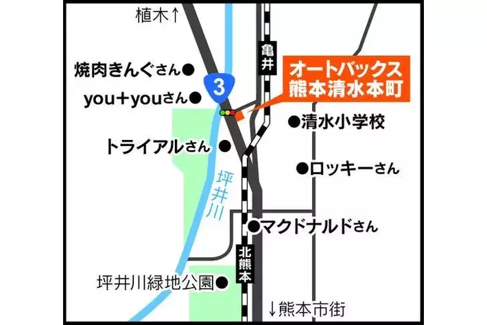 店舗は、熊本電鉄 菊池線 北熊本駅から北側に直線で約0.6km、国道3号沿いの交差点角地に位置します。タイヤ、オイル、バッテリーをはじめとしたカー用品に加え、カーライフの楽しさを提案する幅広い商品や、車検・整備などのサービスを展開いたします。自動車整備に関する知識と技術、提案力を備え、安心してクルマのメンテナンスをお任せいただける店舗として地域のお客様を全力でサポートします。