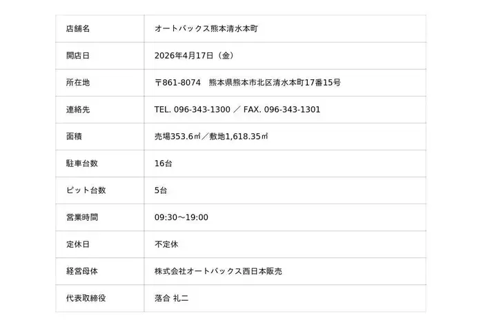 株式会社オートバックスセブン(代表取締役 社長:堀井勇吾)と加盟店契約を結んでいる株式会社オートバックス西日本販売(代表取締役:落合 礼二)は、2026年4月17日(金)に「オートバックス熊本清水本町(くまもとしみずほんまち)」を新規オープンいたします。