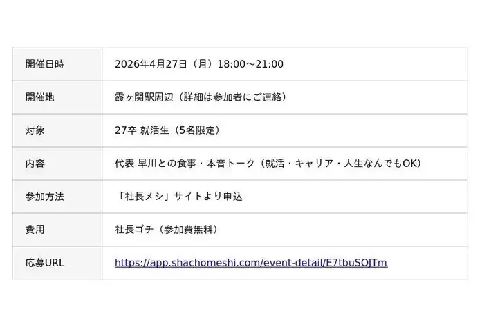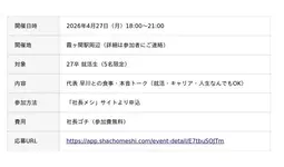 株式会社ジョイカルジャパン(本社:東京都千代田区/代表取締役社長 CEO 早川 由紀夫、以下:ジョイカルジャパン)は、就活生と社長が食事を通じてつながるCtoC就活マッチングサービス「社長メシ」において、2026年4月27日(月)に就活生向け食事会を開催します。