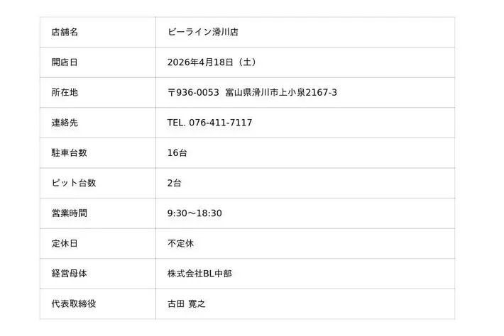 株式会社オートバックスセブン(代表取締役 社長:堀井勇吾)の連結子会社(孫会社)である株式会社BL中部(代表取締役:古田寛之)は、「ビーライン滑川店」を2026年4月18日(土)にオープンいたします。