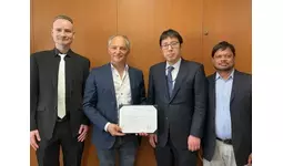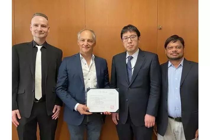 2026年4月17日 国土交通省航空局 航空機技術審査センターにて、ADO認定書受領の様子 - 左から、SkyDrive 耐空・型式証明室長 Harald Nagler、SkyDrive CTO Arnaud Coville、 国土交通省 航空局 安全部 航空機安全課 航空機技術審査センター所長 藤巻 吉博 氏、 SkyDrive 耐空・型式証明室 ADO&プロセス保証グループ マネージャー Yuwaraj Dande