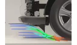 従来のフロントスパッツは車両に固定されており、路面との干渉を避けるために高さを確保する必要があったため、空気抵抗低減に限界がありました。今回新たに開発、採用された「可動式フロントスパッツ」は走行速度に応じて自動で格納・展開します。停車時や低速走行時には格納することで走破性を確保し、高速走行時には独自のリンク構造によって展開することでタイヤにかかる空気の整流効果を最大化し燃費の向上、航続距離の延長に貢献しています。