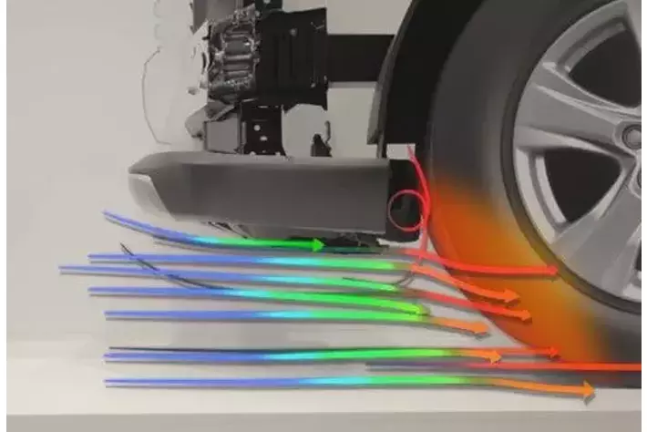 フロントスパッツとは車両のフロントバンパー下部、タイヤの前方に設置され、走行時にタイヤにかかる空気を整流することで空気抵抗を低減し、燃費向上に貢献する製品です。