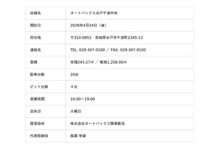 株式会社オートバックスセブン(代表取締役 社長:堀井 勇吾)と加盟店契約を結んでいる株式会社オートバックス関東販売(代表取締役:稲葉 学雄)は、2026年4月24日(金)に「オートバックス水戸千波中央(みとせんばちゅうおう)」を新規オープンいたします。