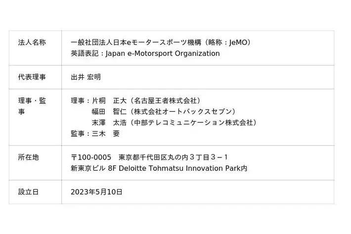 一般社団法人日本eモータースポーツ機構(JeMO)法人概要