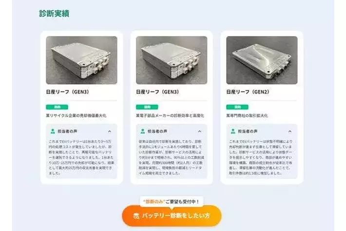 リパーパス製品メーカー担当者は、次のように述べています。「診断時間の短縮に加え、実測値比で±5%以内という精度の高さに驚いています。これまで自社で充放電による診断を行っていましたが、SOH精度が担保された状態で仕入れられる点は、今後の調達において大きな価値があると感じています。」
