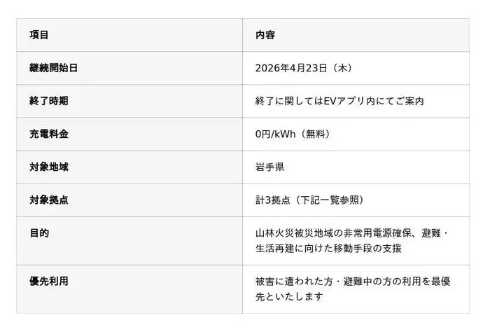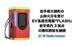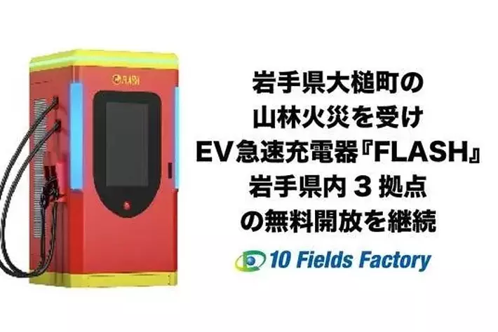 テンフィールズファクトリー株式会社(本社:京都府相楽郡精華町、代表取締役:市川 裕、以下「当社」)は、2026年4月22日に岩手県上閉伊郡大槌町で発生した山林火災を受け、被災地域の電力インフラ支援を目的として、同日より岩手県内に設置しているEV急速充電器『FLASH』3拠点について無料開放を継続することを決定いたしました。なお、4月20日の三陸沖を震源とする地震への緊急支援として実施してまいりました北海道2拠点(苫小牧市・札幌市西区)の無料開放は、2026年4月23日をもって終了いたします。