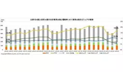 主要12カ国と北欧3カ国(計15カ国)における3月の電動車(xEV)販売台数は199.9万台となった。前年同月比で3.5%減、前月比では57.9%増だった。電動車のシェアは34.3%で前月の30.9%から3.4ポイント増加した。1~3月の電動車累計販売台数は前年同期比7.5%減の465.0万台で、自動車販売全体に占めるシェアは32.3%となった。
