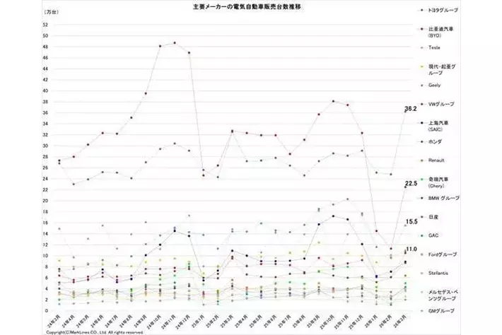 中国メーカーは前月から台数を増やしたが、前年同月比で見ると、BYDが31.1%減、Geelyが25.0%減と引き続き伸び悩んでいる。HEVの好調に支えられたトヨタは前年同月比11.5%増となった。