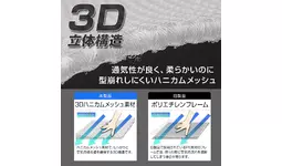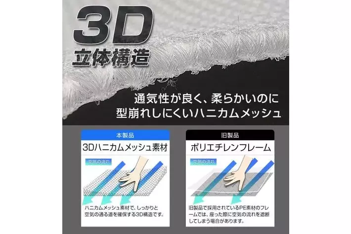 独自の立体構造を採用した3Dメッシュ素材により、座った状態でも空気の通り道をしっかり確保。旧来のPEフレーム製で課題だった「座ると風が遮断される」「お尻が痛くなる」といった不満を解消し、ソフトな座り心地と圧倒的な通気性を両立しました。