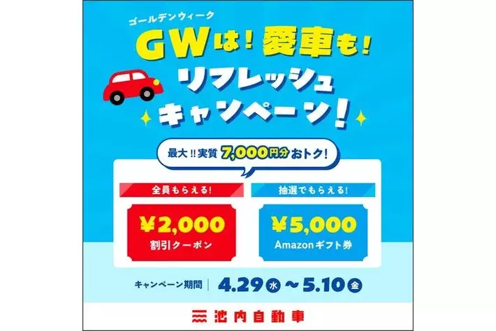 【2026年4月29日開始】格安板金の池内自動車、GW期間中に最大7,000円相当を還元する『GW愛車リフレッシュキャンペーン』を全店一斉開催!
