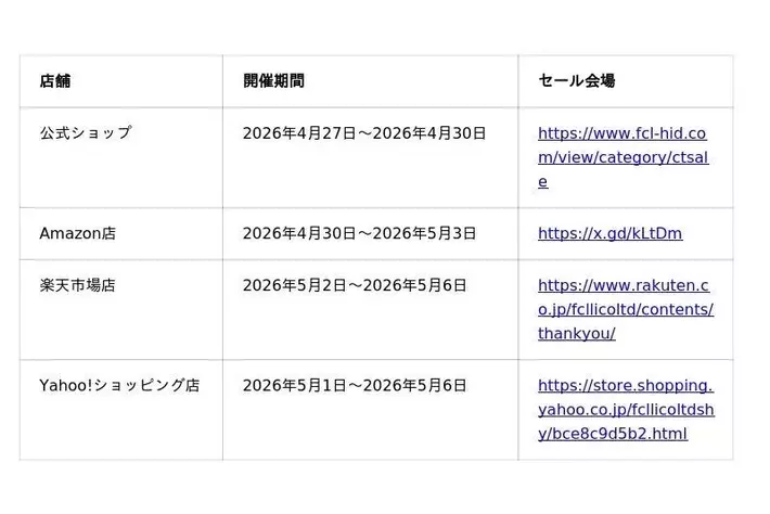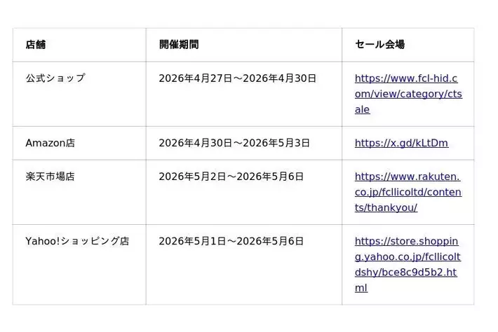 エフシーエル(fcl.)の全店舗(公式サイト、Amazon店、楽天市場店、Yahoo!ショッピング店)が連動し、店舗ごとに特色のあるお得なセールを開催します。