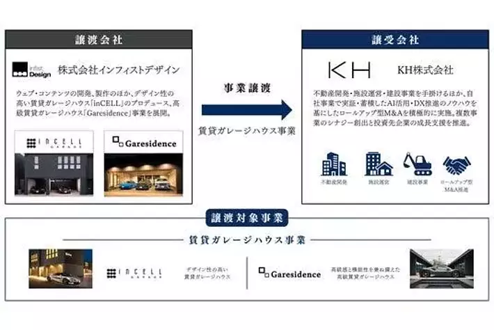 KH株式会社(本社:東京都新宿区、代表取締役:堀口 圭、以下「KH」)は、株式会社インフィストデザイン(本社:東京都小平市、代表取締役:須田 力、以下「インフィストデザイン」)が展開する、デザイン性の高い賃貸ガレージハウス「inCELL(インセル)」および高級賃貸ガレージハウス「Garesidence(ガレジデンス)」に関する事業を譲受したことをお知らせいたします。