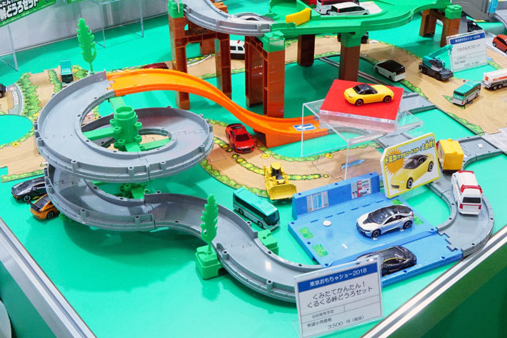 タカラトミーブースのトミカコーナーでは、トミカの大ジオラマのほか、2018年8月発売予定のフェラーリ(トミカ No.62 ラ・フェラーリ、トミカプレミアム No.06 テスタロッサ、トミカワールド フェラーリショールーム)、各種トミカワールド(くみたてかんたん!くるくる峠どうろセット、コースをチェンジ!オートやまみちドライブなど)、マーベルチューンやディズニーモータースの新商品など、今後発売される予定の新商品も多数展示されていました。