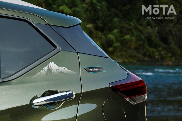 日産 キックス コロンビアエディションのボディカラーは、チタニウムカーキとダークブルーの2色。外装には、コロンビアのコーポレートカラーであるブルーのグリルステッカーと、サイドとリヤには、コロンビアのロゴステッカーを貼付。さらにコロンビア誕生の地、オレゴン州最高峰のフッド山をあしらったグラフィックステッカーをサイドに配した。