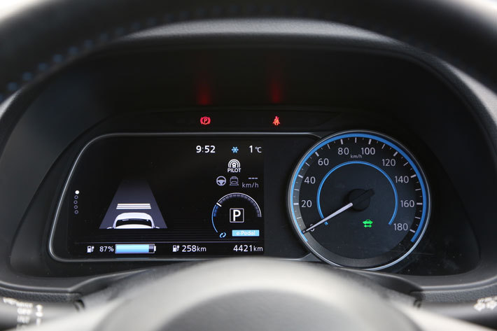 さらにリーフの場合は回生ブレーキだけでなく、その後の停止前に従来の機械式ブレーキの制動を行う協調制御をしているため、よりきめ細やかな制動に加え、ノートe-POWERではできなかった完全な停止保持もしてくれるようになった。もちろんブレーキランプも減速Gに応じて点灯するし、停止時も点きっぱなしになる。