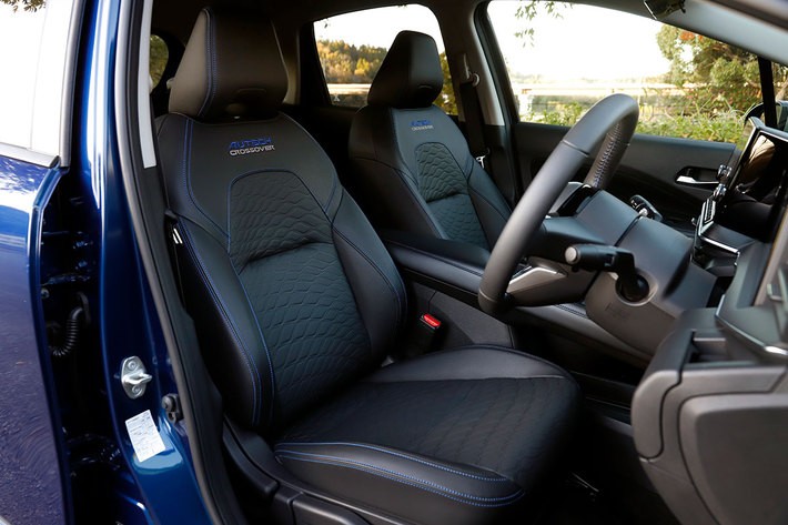 インテリアにはノート AUTECHと共通のイメージを残しつつ、シート表皮をブラックに統一。クロスオーバーにふさわしい力強さと、機能的な雰囲気が付与されている。フロントシートバックには、AUTECHロゴ以外にも銀色の糸で「CROSSOVER」の文字を追加している。