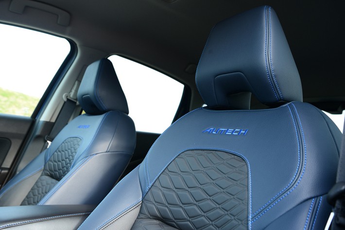 フロントシートバックのAUTECHロゴもブルーで刺繍されている。このほかシートのセンターには、オーテックジャパンが立地する、湘南の海のさざ波を連想させる立体デザインを施している。他のクルマと比べられるものではないクラスレスといえる品質感も、ノート AUTECHの魅力だ。