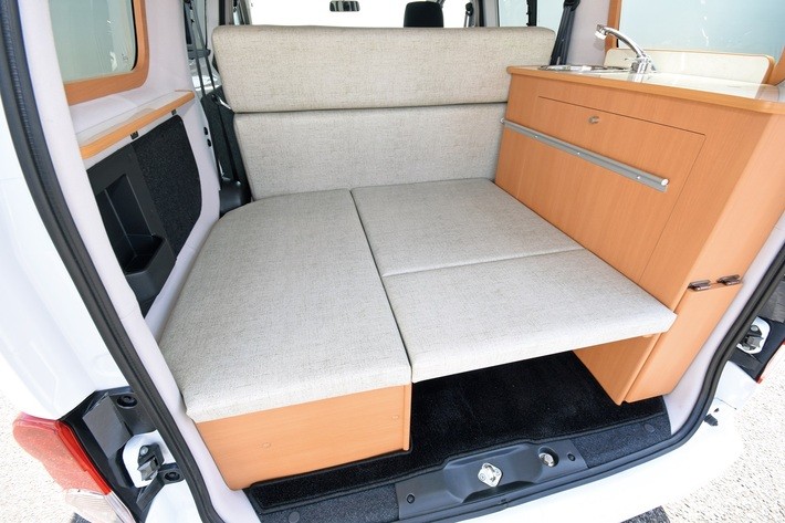 ドライブモードからセカンドシートの背もたれを倒し、ヘッドレストを取り外した後にサブマットを入れるだけで完成。 1960mm×1200mm(ギャレー部分は1060mm)のベッドが完成。ヘッドレストはセカンドシートと運転席・助手席の間に格納できる。