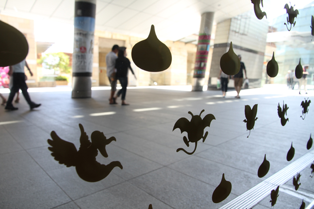 ガラス面に描かれたドラゴンクエストのモンスターたち