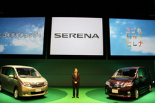 新型セレナのキャッチフレーズは「エコモデルチェンジ!」、日産のエコカー“PURE DRIVE”第4弾としてアイドリングストップを搭載し、クラストップの15.4km/Lの低燃費を実現した。
